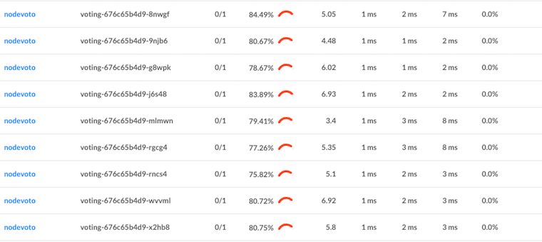 Linkerd also gives us built-in traffic-level dashboards, so we don’t even need to guess what’s happening from CPU charts any more. Here’s a Linkerd graph that’s showing the success rate, request volume, and latency percentiles of each pod:
